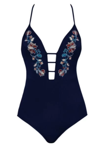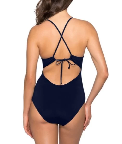 flair. The piece has a plunge neckline with a cage tie effect, fine