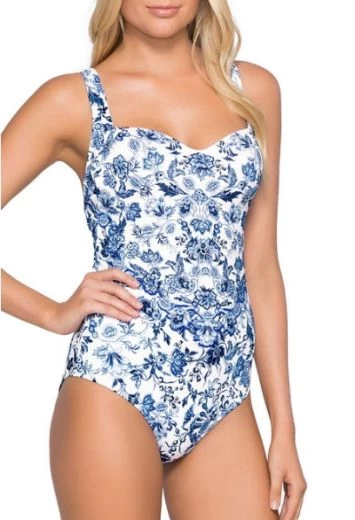 swimsuit features a delicate antique blue motif perfect for summer days.