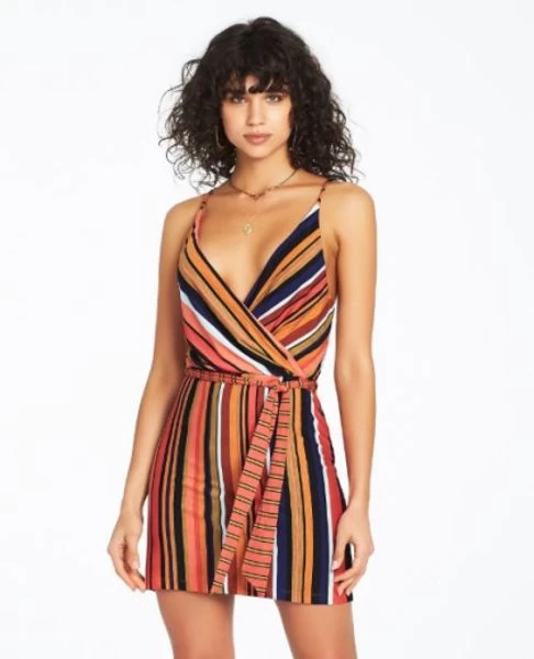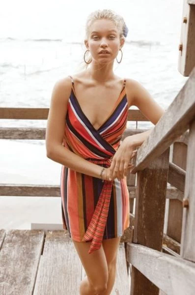 Strappy short fixed wrap dress featuring adjustrable fine rouleau straps