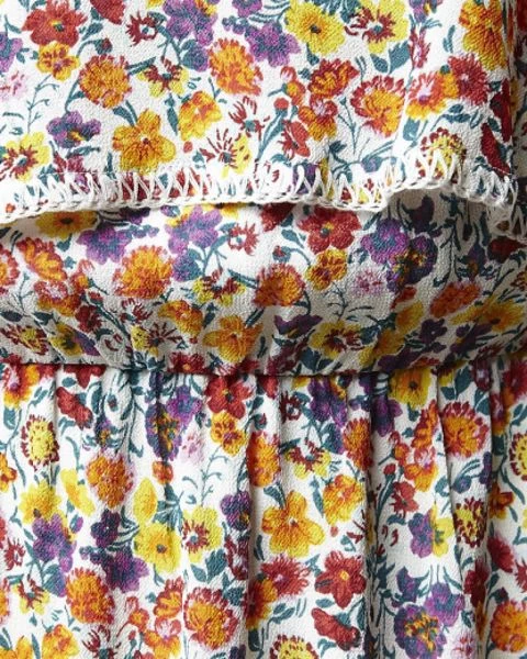 Layered frill on bodice at neck with blanket stitch detail on edge .